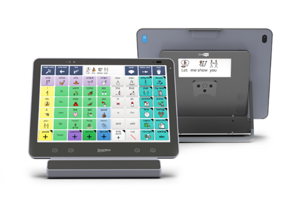 - urządzenie posiada drugi ekran znajdujący się z tyłu urządzenia pokazujący wiadomości tekstowe z oprogramowania do komunikacji alternatywnej